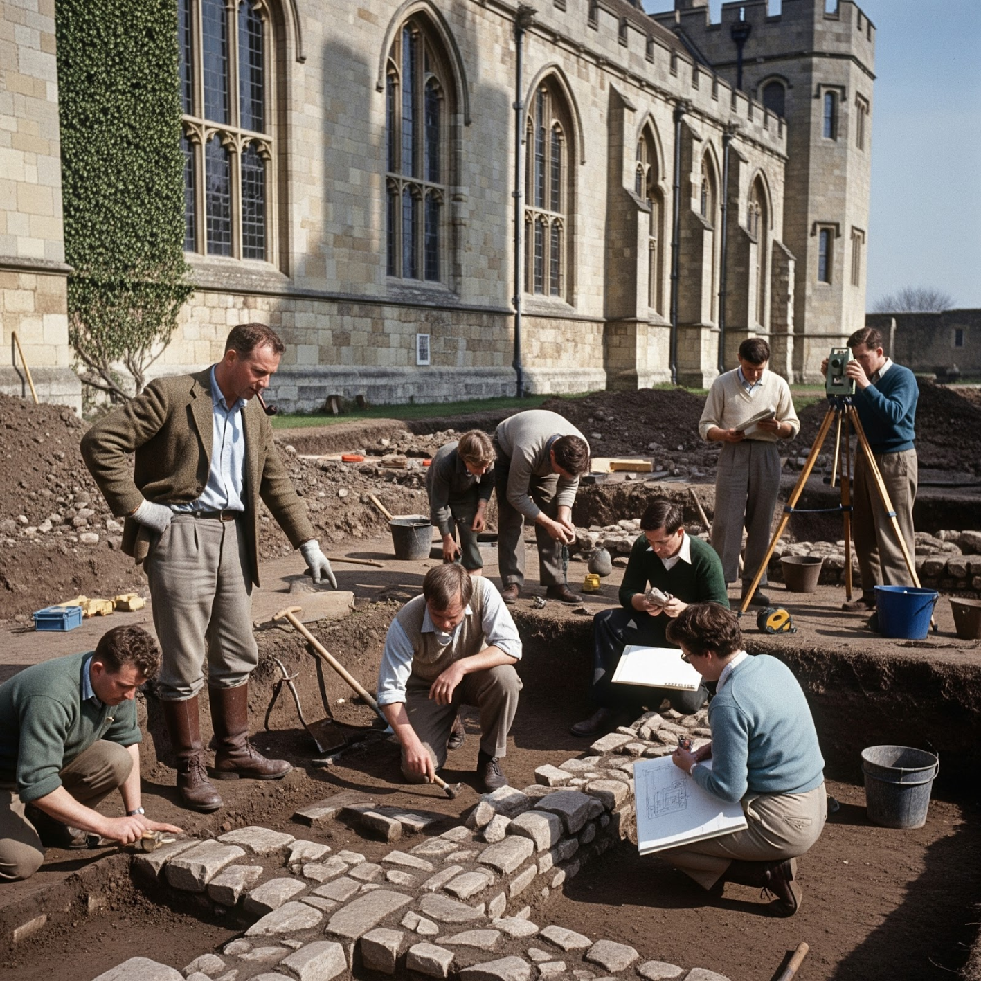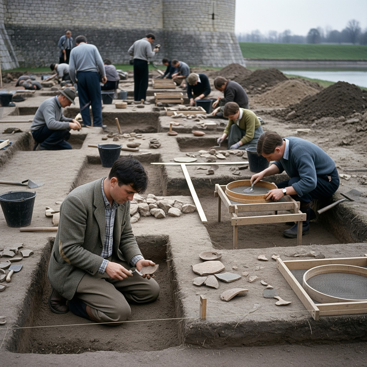 Peter Gathercole conducts an archaeological excavation of the moated area to the south of the bailey.
