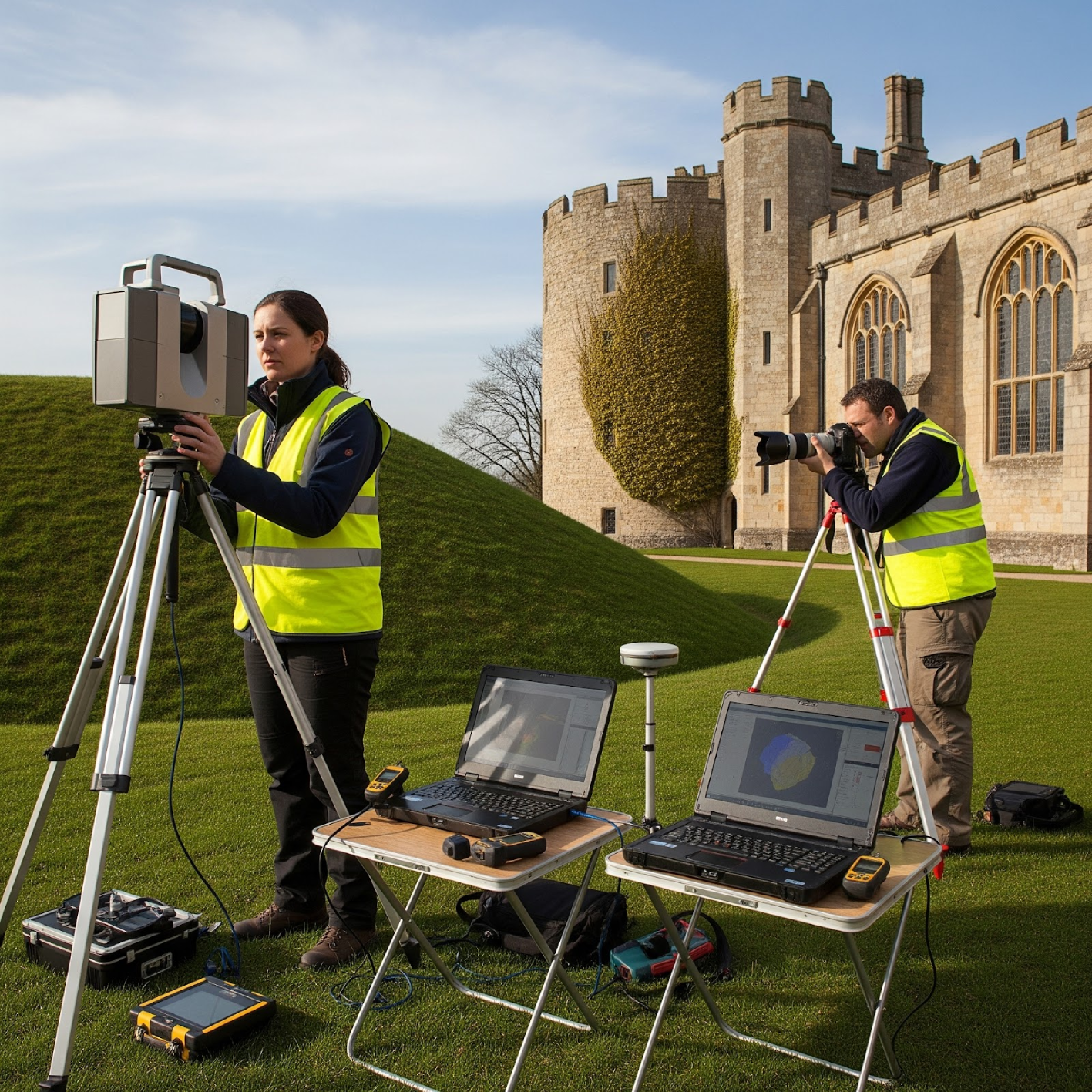 Terrestrial laser scan and photographic survey of the defence earthworks, the Great Hall interior, and Cutts Close by Trent & Peak Archaeology.