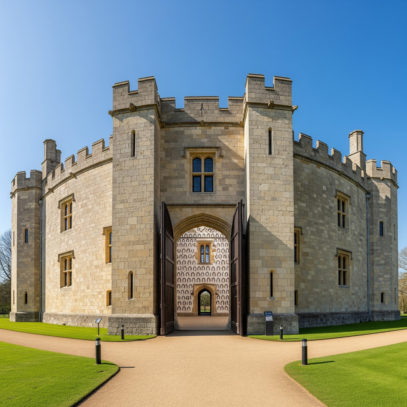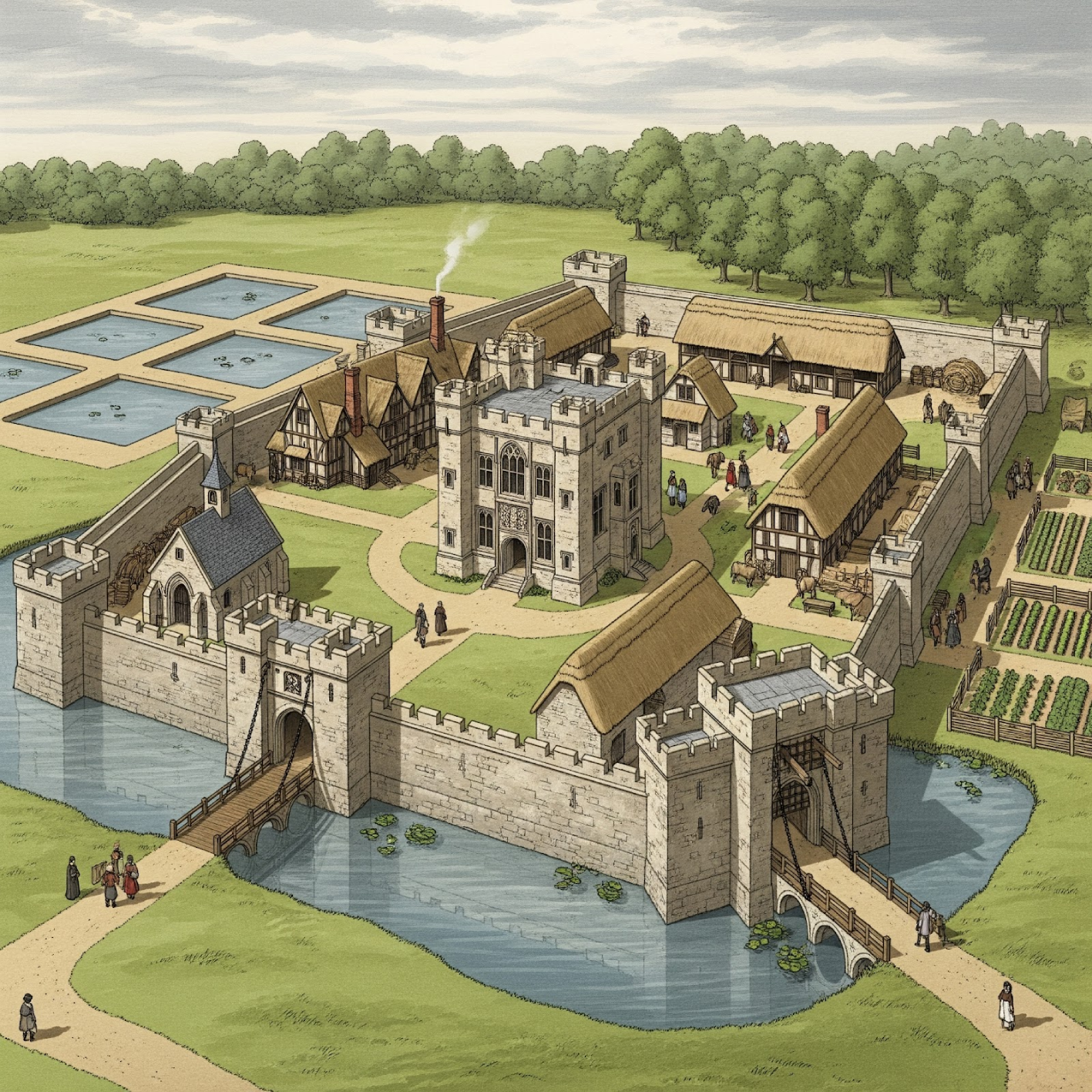 At Oakham there is a certain castle, well walled, and in that castle are a hall, four rooms, a chapel, a kitchen, two stables, a barn for hay, a house for prisoners – the county gaol, a room for the gatekeeper, and a drawbridge with iron chains. The castle contains within its wall an estimated two acres of ground. The same is called the manor of Oakham. Outside the castle is a garden, and fish ponds and a moat.