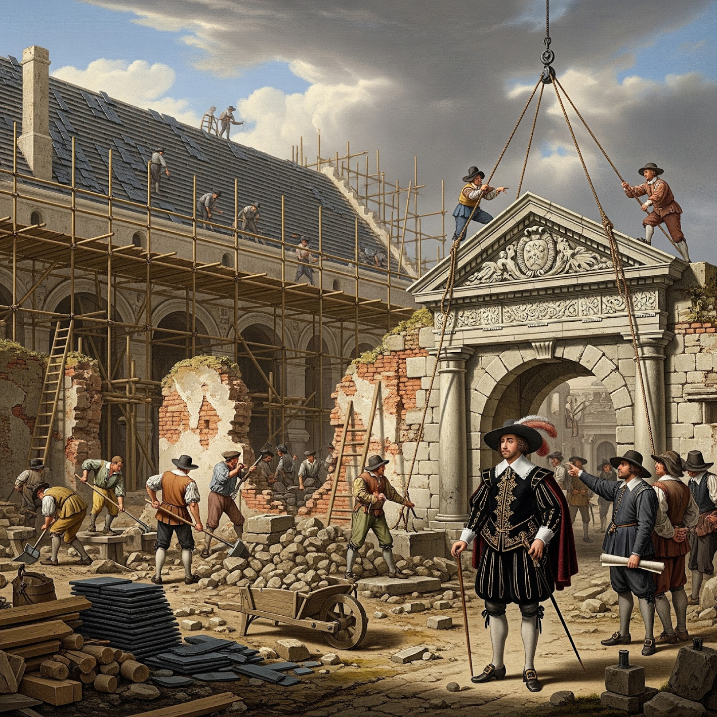 George Villiers, Duke of Buckingham, now resides in the first big house at Burley on the Hill. He probably: Levelled the ruins around the castle and the old domestic offices at the east and west end; Re-roofed the great hall and Installed a new pediment over the Castle Lane gateway.