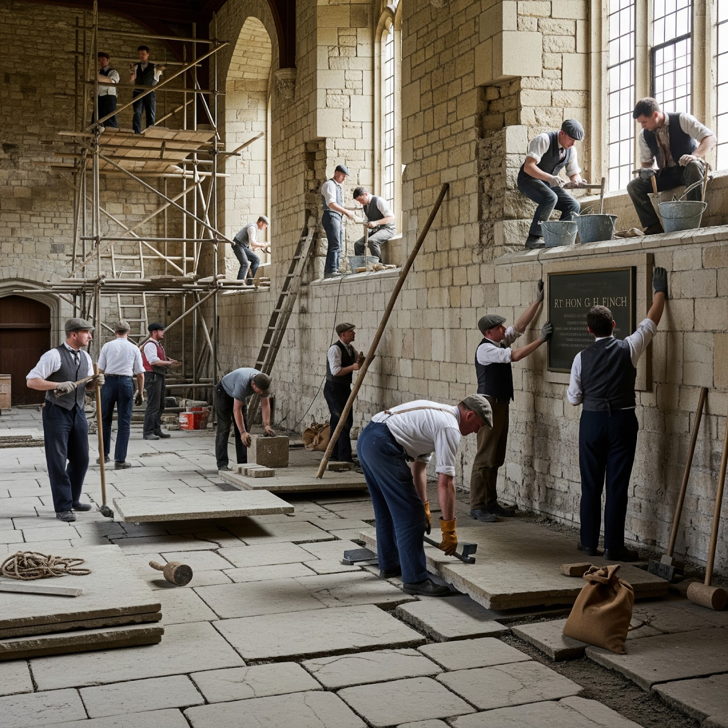 The Great Hall is restored in memory of the Rt Hon G H Finch, MP for Rutland for 40 years, with extensive repairs to the east wall and the stone flagged floor.
