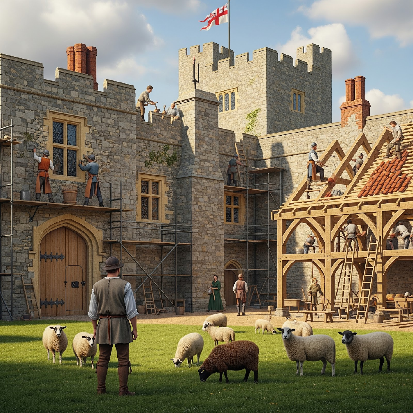 The Great Chapel and the King’s two great chambers are pargeted and whitewashed. A chimney is inserted in the chamber by the gate. In the following year a new chapel and chamber are built, with a passageway connecting the chapel to the hall. It has stone walls, a tiled roof, and three glazed windows.
