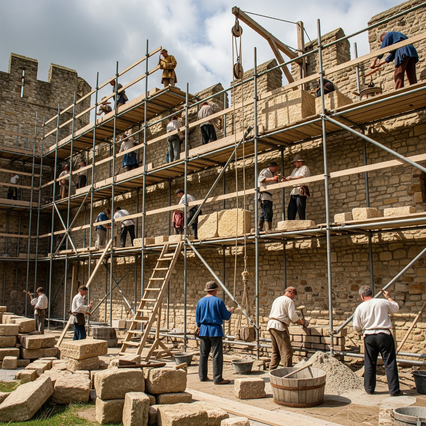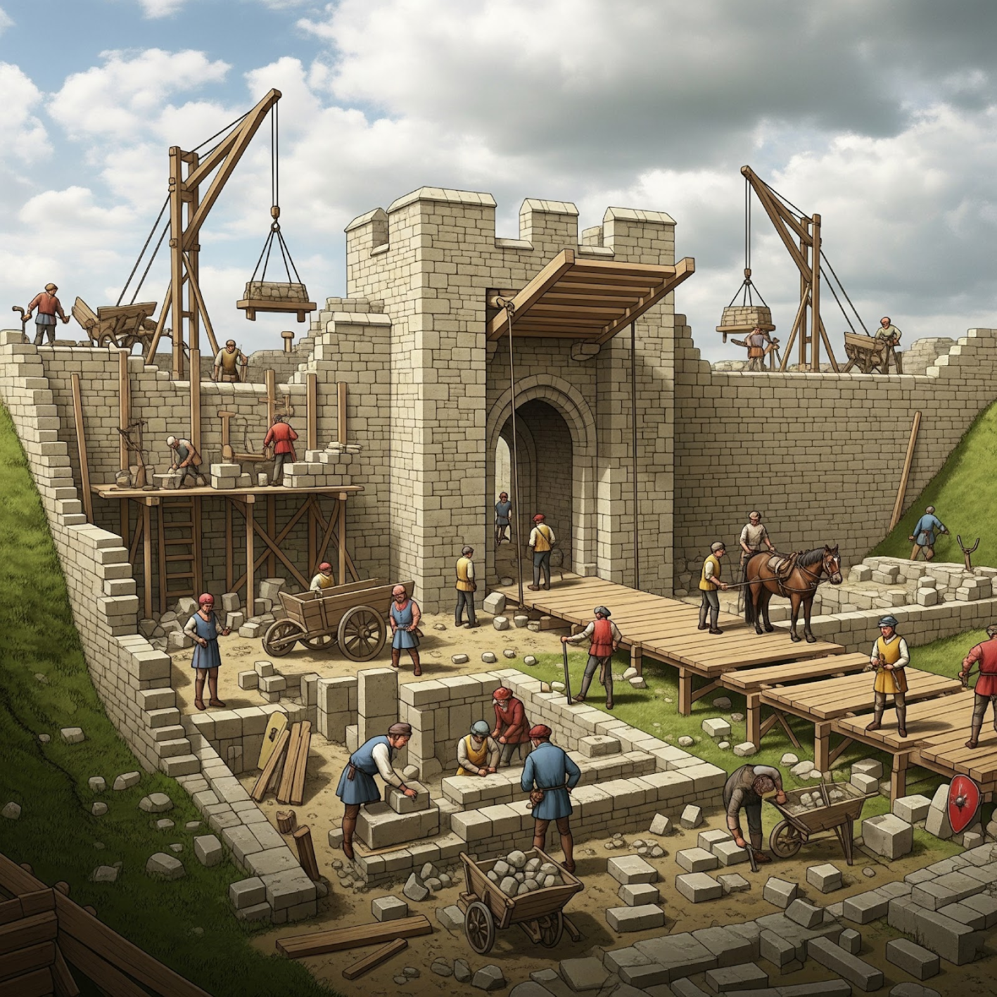 A gateway and drawbridge and a stone curtain wall are built against the existing earthworks